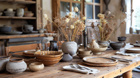A rustic wooden table set with earth-tone ceramics, linen napkins, and dried flowers, creating a warm atmosphere