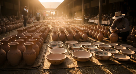 An artisan potter works among rows of handmade clay pots displayed on mats in a sunlit outdoor market. The scene captures the tradition of ceramic craftsmanship and cultural trade.