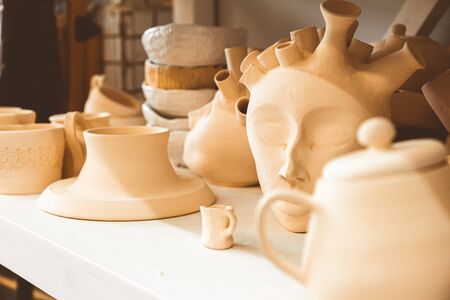 Shelves with bowls, plates, jars, teapots, etc. made in clay in natural raw color until the final painting. Crafts in clay. Close-up.