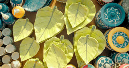 Traditional Moroccan market with souvenirs. Handmade ceramic cups