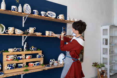 Ceramist photographing his earthenware products in pottery studio
