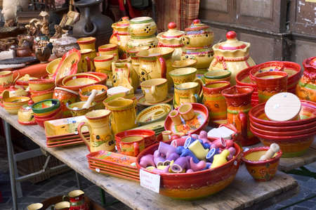 Ceramic dishes, tableware and jugs sold on Kaziuko muge or Kaziukas spring fair, traditional Easter market in Vilnius, Lithuania