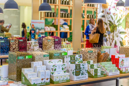 BOLOGNA (ITALY), SEPTEMBER 10, 2018: Visitors are visiting a stand and asking exhibitor about the products at SANA, international exhibition of organic and natural products