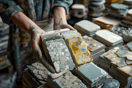 Person holding polished stone samples with various patterns and colors in a workshop filled with stone slabs.