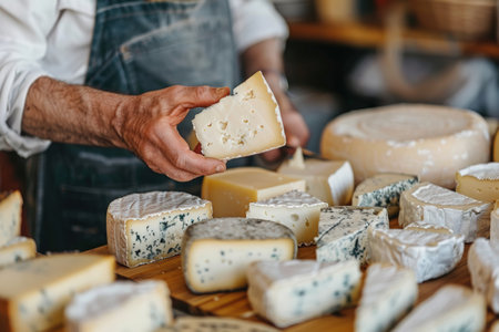 Close-up of a cheesemonger's hand holding a delicious piece of artisanal cheese from a diverse selection including blue cheese, brie, and cheddar, on a rustic wooden table in a gourmet food shop