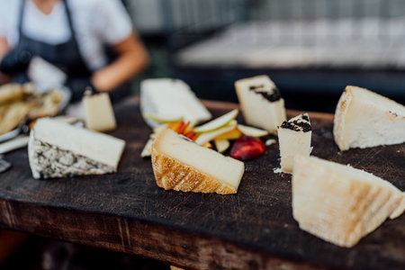 Cheese set on stand at street food festival in city. Different types of cheese, brie, blue,gorgonzola,goat, parmezan on wooden table.Street food festival
