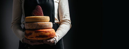 Cheesemaker holding artisanal rounds in rustic cellar, cheese craftsmanship concept