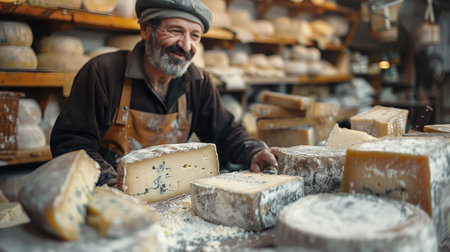 A man is a cheese maker who makes delicious cheese in a cheese factory.