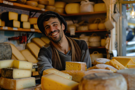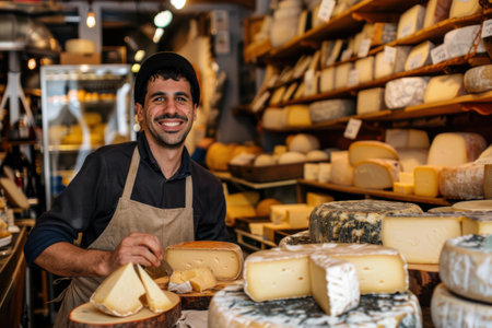 Trendy 30-year-old cheese vendor in a European store, displaying cheese