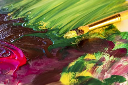art brushes and paints for painting pictures, oil and other paints with brushes for creativity, the creative process of drawing by mixing different colors of paints with art brushes