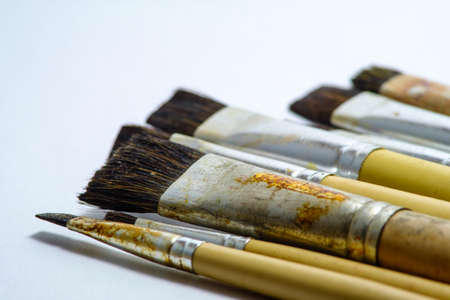 Artistic art supply utensils with paintbrushes isolated on white background with selective focus