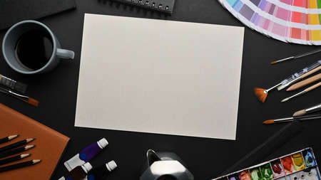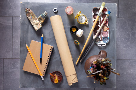 Top view of professional artist studio with sketch paper, painting tools, water colours and office supplies