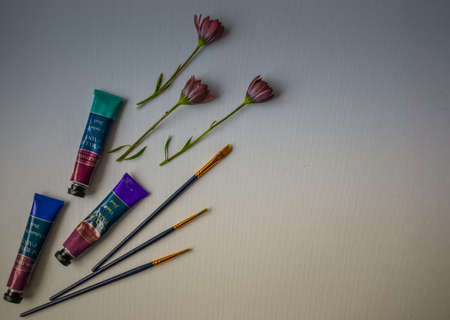 UK/Hove 11/03/2019 - Acrylics paints and three Boldmere brushes, and dry flowers. view from above