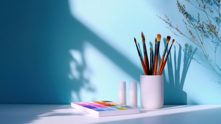 An artistic display of painting supplies arranged on a white surface. AI-generated.