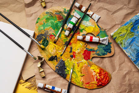 Wooden palette of the artist with used brushes and tubes of paint.