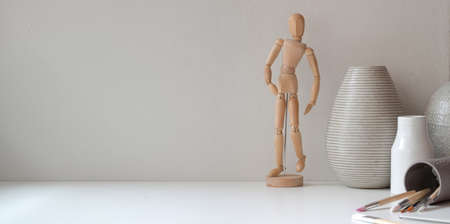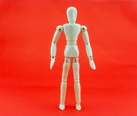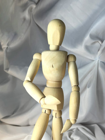 Wooden drawing model mannequin to help show poses for artists on white textile background