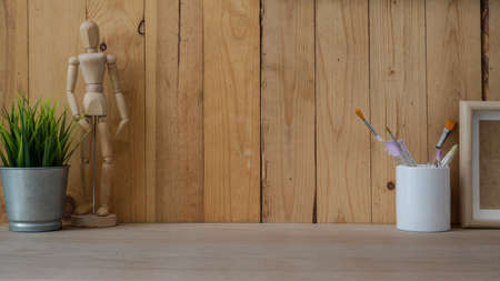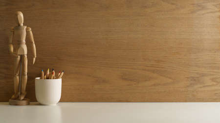 Close up view of workspace with wooden figure, pencils and copy space with wooden wall background, mock up scene
