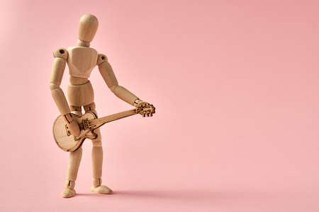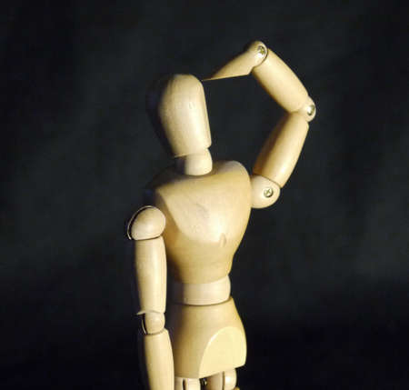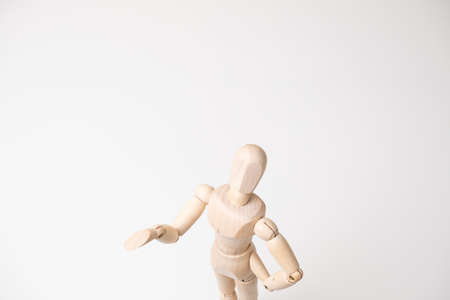 Wooden doll as a model for drawing on a neutral background. Concept of asking for help, sadness, loneliness and begging.