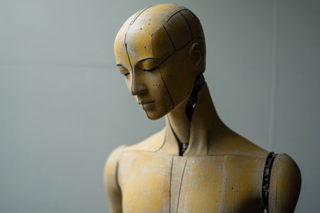 Articulated mannequin with a geometric pattern, set against a backdrop of interlacing lines.
