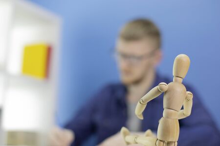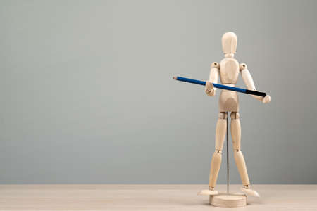 Male artist with a wooden dummy in hands drawing Creative hobby blue background