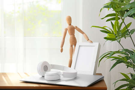 Wooden doll and a blank piece of paper. Wooden mannequin with sheets of paper concept, blank space. Creativity and art