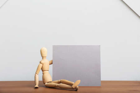 Wooden mannequin holding blank poster on gray pastel background. copy space, isolated, presentation concept.