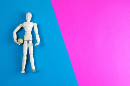 Wooden figurine of a man with a ball on a blue and pink background with clear space for text.