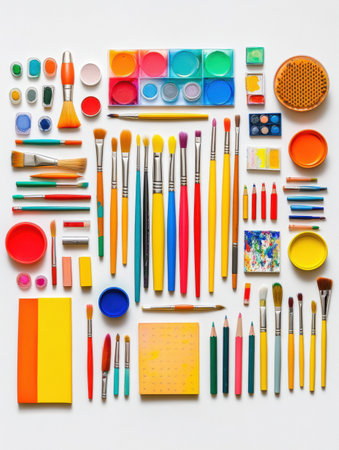 Flat lay of art supplies like watercolor paints, brushes, sketchbooks, and colored pencils on white table, back to school preparation theme, soft shadows, clean layout