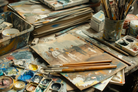 Art supplies arranged on a rustic table with colorful watercolors and brushes awaiting creative inspiration in a cozy studio