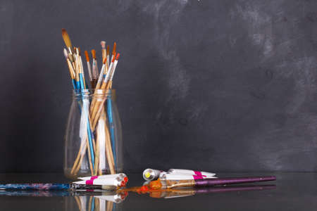 Paint brushes and watercolor paints on the table in a workshop, selective focus, close up.