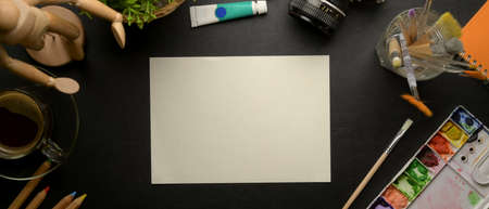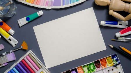 Top view of professional artist studio with sketch paper, painting tools, water colours and office supplies
