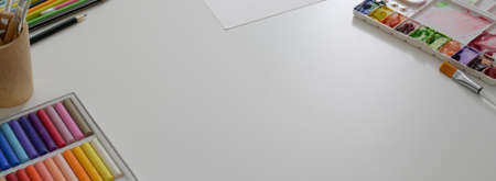 Top view of artist workspace with sketch paper, oil pastels, painting tools and copy space on white desk