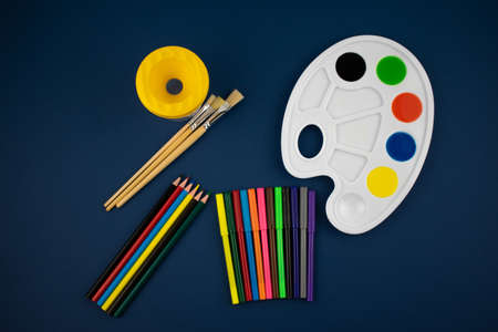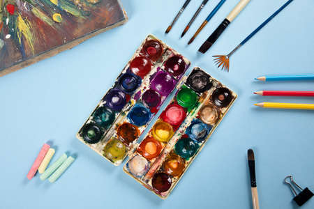 a set of brushes, a sketchbook, and bright watercolors on a blue background. the concept of creativity