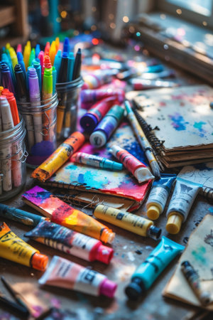 A vibrant scene showcasing an artist's workspace filled with various paint colors, brushes, and creative tools, inviting artistic inspiration and creativity.