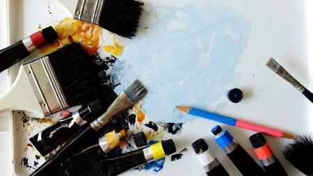 Painter workplace with tubes of multicolor oil paint and paintbrushes on painted paper close up.