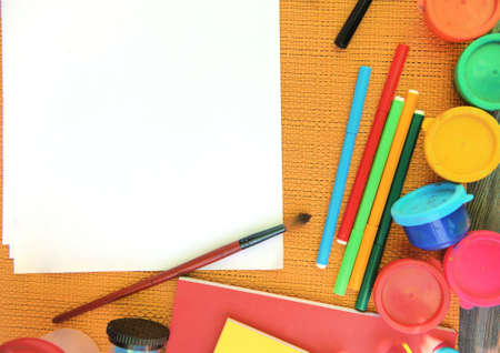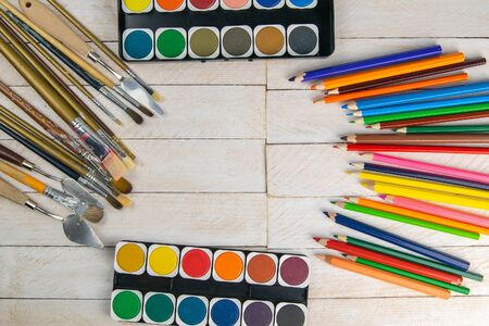 on the table are the artist's accessories, colorful colors, white paper, brushes and pencils