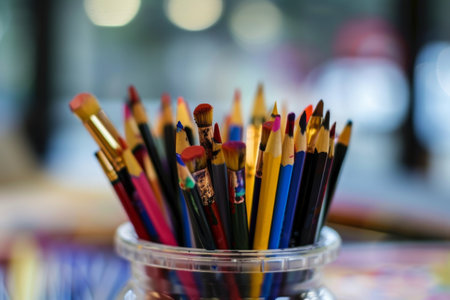 paint brushes and artist pencils on the desktop