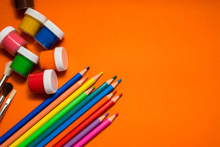 School supplies isolated on colorful background. colorful pencils and watercolors, back to school concept
