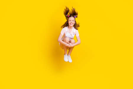 Full length body size photo schoolgirl jumping up cheerful happy isolated bright yellow color background