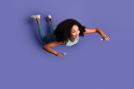 Joyful young woman in stylish summer attire floating against vibrant purple background