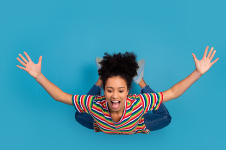 cheery girl jumping having fun free time vacation isolated on bright vivid shine vibrant blue color background