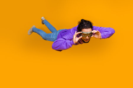 Funky man floats in mid-air wearing goggles and sports a purple hoodie against a vibrant yellow background embodying creativity