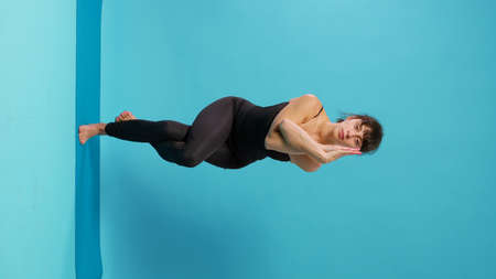 Vertical video: Fit woman doing balance exercise after workout activity on yoga mat. Person stretching muscles and recovering from physical training in studio, relaxing after gymnastics practice.