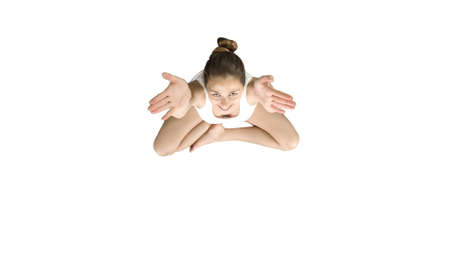 Beautiful woman sitting without yoga mat in lotus pose on white background.