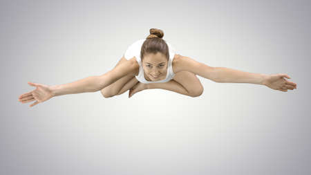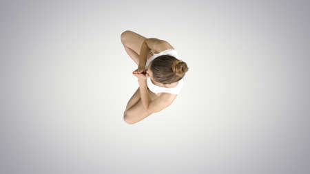 Woman sitting in lotus pose and looking up to camera on gradient background.