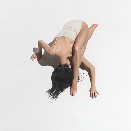Young beautiful dancer in beige dress dancing on gray background