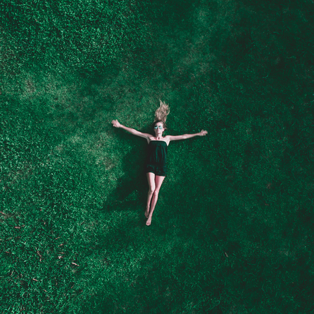 Aerial top view of happy woman relaxing on the grass during sunny summer day
