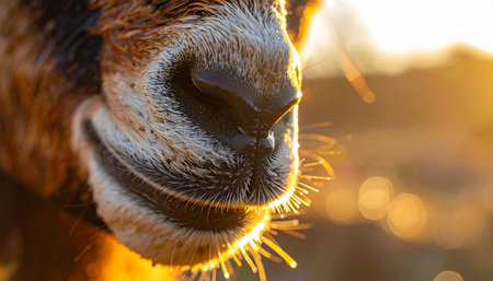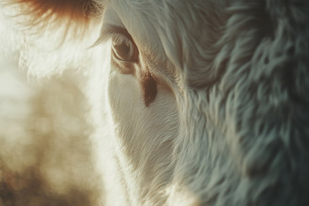 Detailed view of a cows face, showcasing soft fur textures lit by warm sunlight amidst a blurred farm background, creating an elegant rural atmosphere.