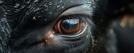 Close up of a cows eye reflecting landscape, intricate details. Nature and agriculture concept