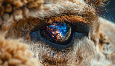 A stunning macro shot captures a world within a world. The detailed eye of an alpaca holds a vivid reflection of a majestic mountain range, symbolizing a deep connection with nature, dreams of adventure, and a unique perspective on the world.